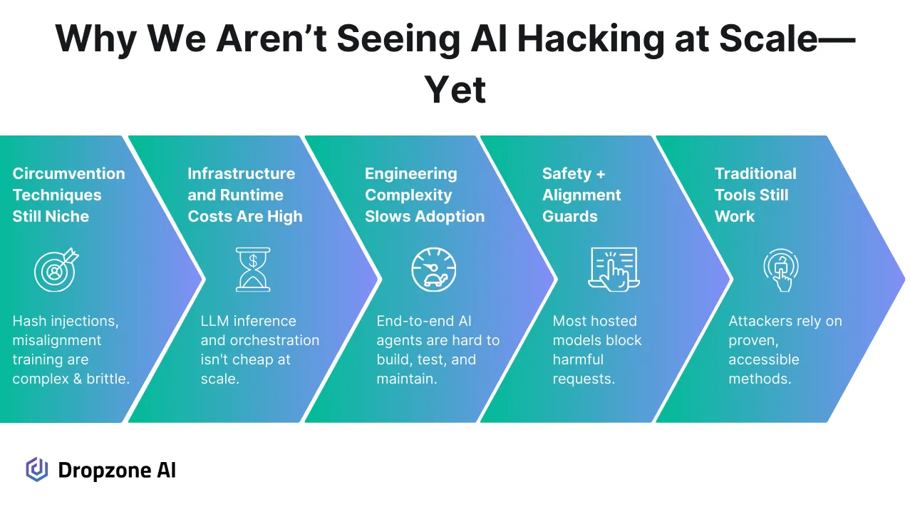 - Building effective agentic AI tools is still difficult and costly. Complex engineering, alignment controls, and infrastructure costs are major barriers to large-scale AI attacks from becoming mainstream.
