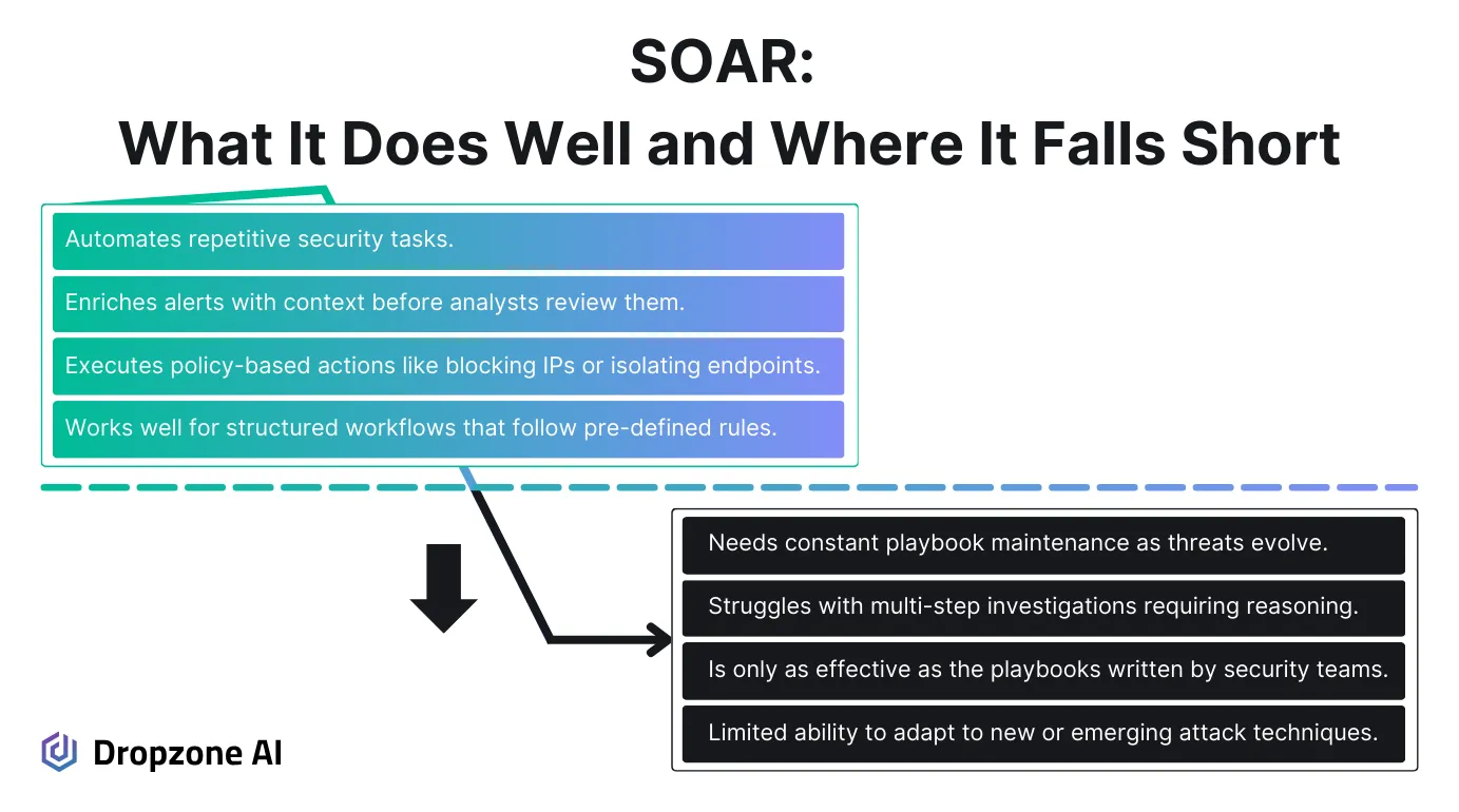 Security teams often struggle to keep up with these changes, leading to outdated automation workflows that increase the risk of missing threats or creating alert fatigue. Another challenge is that SOAR follows static instructions and doesn’t adapt dynamically when an investigation requires deeper analysis.