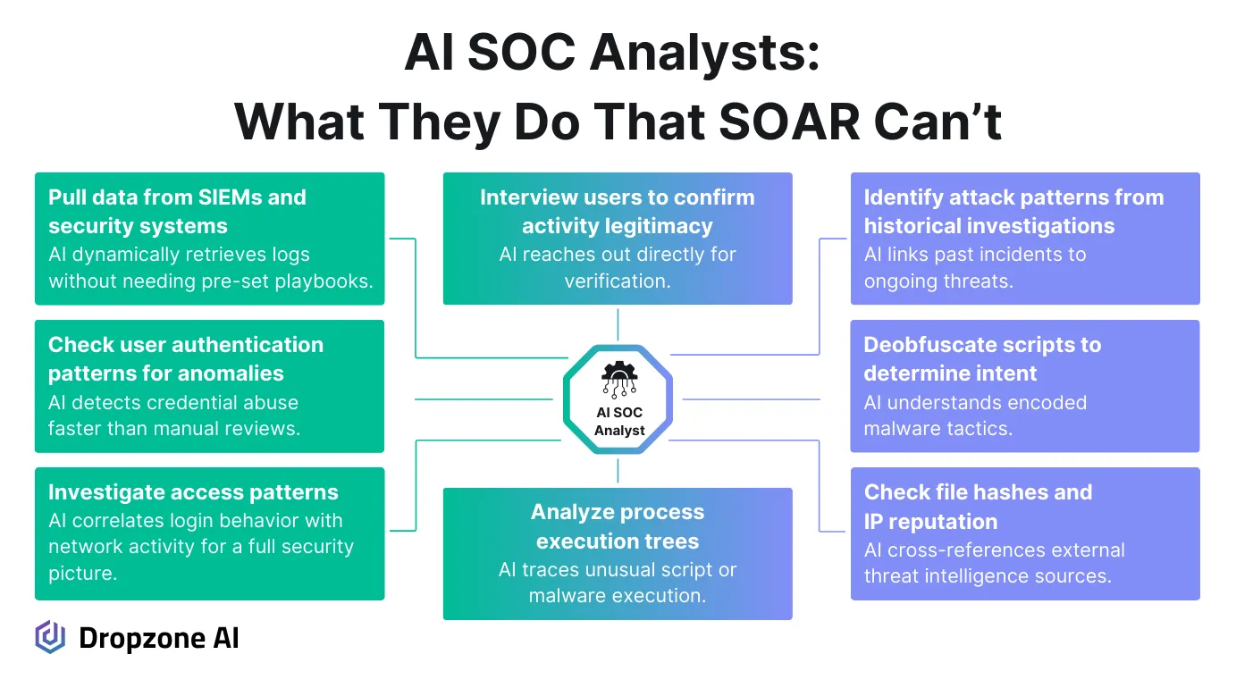 SOAR remains an important part of security automation, but it reaches its limits when dealing with complex, multi-step investigations. AI SOC analysts fill this gap by applying reasoning, analyzing real-time security data, and reducing reliance on static playbooks. By combining SOAR’s response automation with AI-driven investigations, organizations gain a more adaptive, efficient, and scalable security operation. Teams looking to improve their detection and response capabilities should consider how AI SOC analysts can work within their existing workflows to automate investigations, reduce false positives, and accelerate threat resolution. See how Dropzone AI SOC analysts can enhance your security operations. Book a demo today.