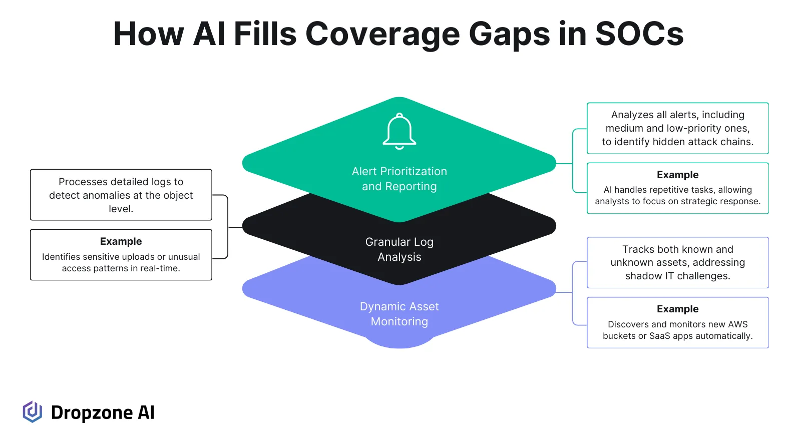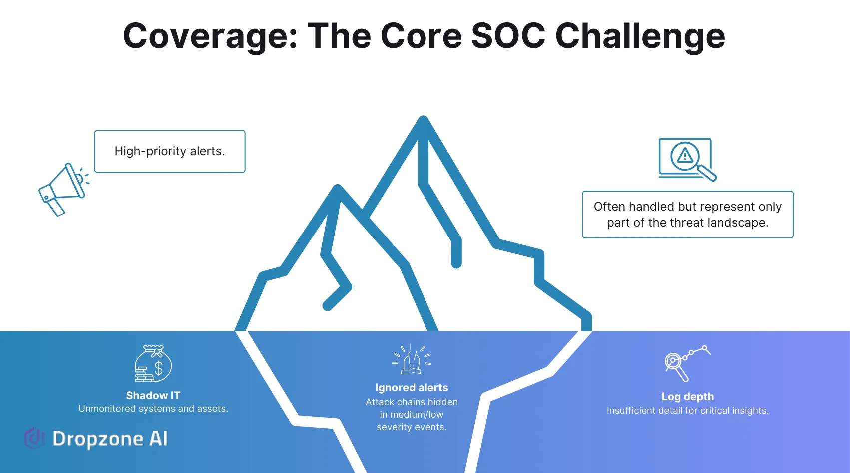 Coverage is central in making SOCs more effective by helping detect and respond to threats that might go unnoticed. AI enhances this by identifying shadow IT assets, providing detailed visibility into activity, and handling high volumes of alerts, freeing analysts to focus on tasks that need their expertise. This isn’t replacing SOC analysts but helping them work faster and smarter. If you want to see how AI can transform your SOC, watch the podcast with Caleb Sima and Dropzone AI Founder Edward Wu or explore the Dropzone AI demo gallery.