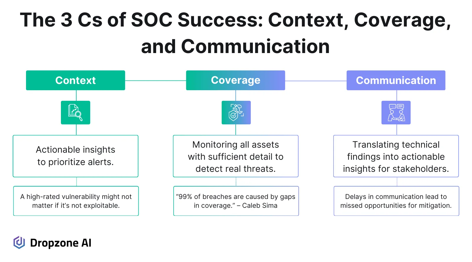 Security Operations Centers (SOCs) face constant challenges, from managing endless alerts to addressing visibility gaps, often leading to missed threats and breaches. To improve efficiency, SOCs must focus on the 3 Cs: Context, Coverage, and Communication. Coverage is the biggest challenge among these, as gaps often cause incidents to go unnoticed. This article explores the 3 Cs, focusing on how AI will dramatically increase coverage for SOCs, drawing insights from Caleb Sima’s BSides SF 2024 talk, Unlocking the Future: AI is the Key to CISOs Top Challenges.