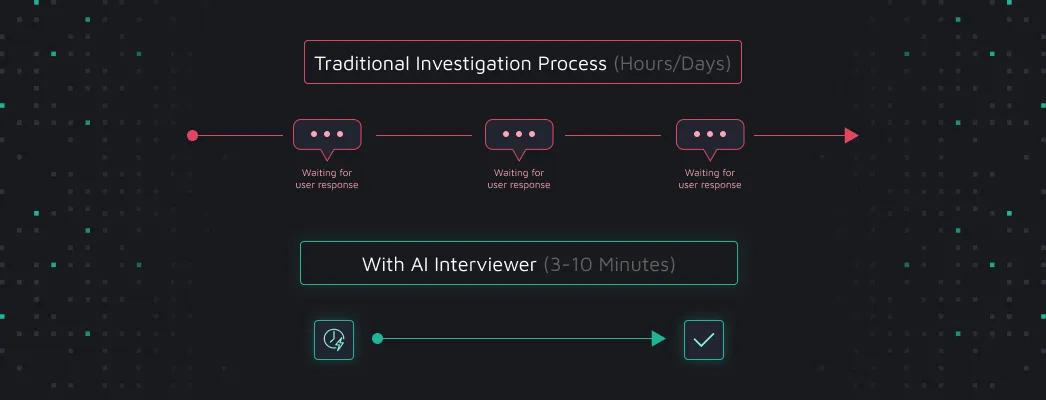 With AI Interviewer, the most common human-dependent bottleneck is also removed from the equation. The result? Investigations that typically complete within 3-10 minutes, including user context gathering. This makes it possible for security teams to more quickly respond to attacks where minutes matter, such as in the Coinbase security incident detailed above.