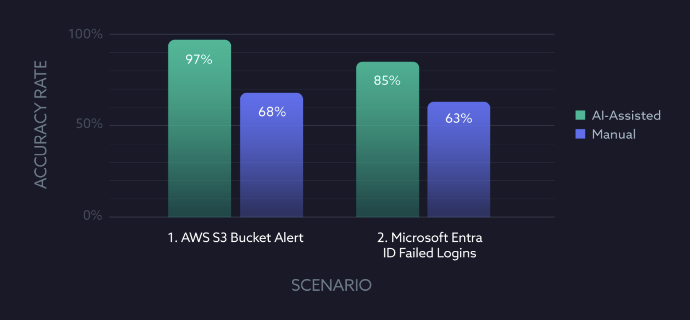 - Speed: AI-augmented analysts completed the investigations 45–61% faster across the two scenarios.