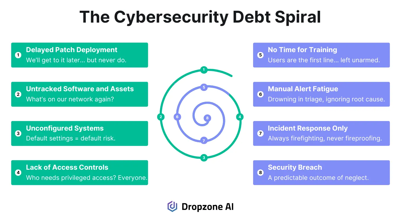 Cybersecurity debt is the accumulated risk from deferred security tasks like patching, configuration management, and access reviews. It forms when teams spend most of their time on reactive alerts instead of preventive controls. AI SOC agents like Dropzone reduce this debt by automating alert triage, freeing 10-20 hours weekly for foundational security work that prevents future incidents.