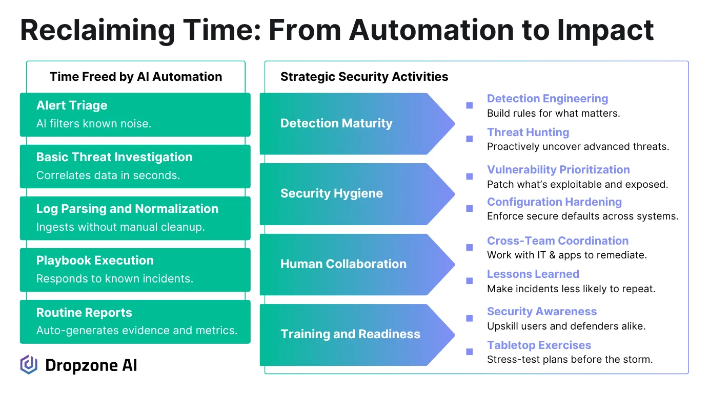 This shift isn’t limited to Dropzone. Other AI-driven tools, such as SOAR and detection-as-code pipelines, support this transition. But reclaiming time isn’t enough.