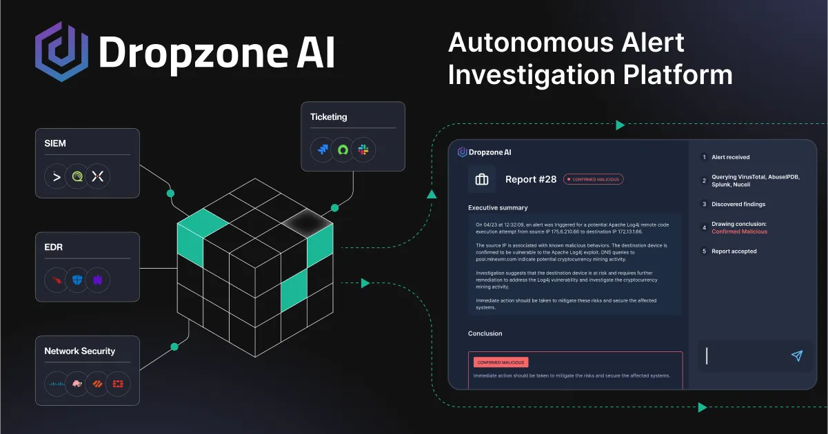 At Dropzone AI, we are building AI agents capable of performing the first level of analytical work in SOCs autonomously. The AI agents mimic expert human analysts’ decision-making process, understand the intricacies of cybersecurity, and adapt to an ever-changing threat landscape to thoroughly and autonomously investigate all alerts. SOCs send their alerts to our system, and for every single alert, Dropzone will autonomously perform an end-to-end investigation (swivel chairing across their existing security stack) and generate an investigation report that details the related context and whether the alert should be treated as a true positive or false positive. These agents work 24/7 and never tire, ensuring no threat goes unnoticed and leaving the human analysts free to focus on the top priorities.