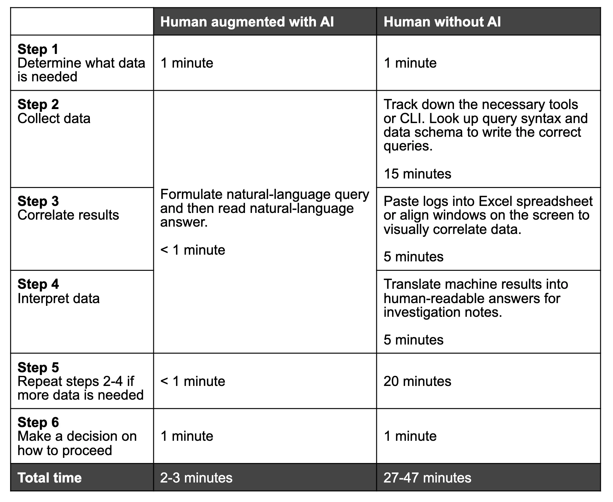 Let’s compare the time required for an AI-augmented workflow with a traditional workflow: