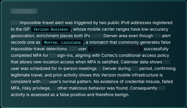 Because mobile IPv6 ranges, especially from carriers like Verizon, often rotate across regional gateways, geolocation changes of this kind can appear more dramatic than they are. Dropzone AI treated the distance signal as uncertain pending additional context.