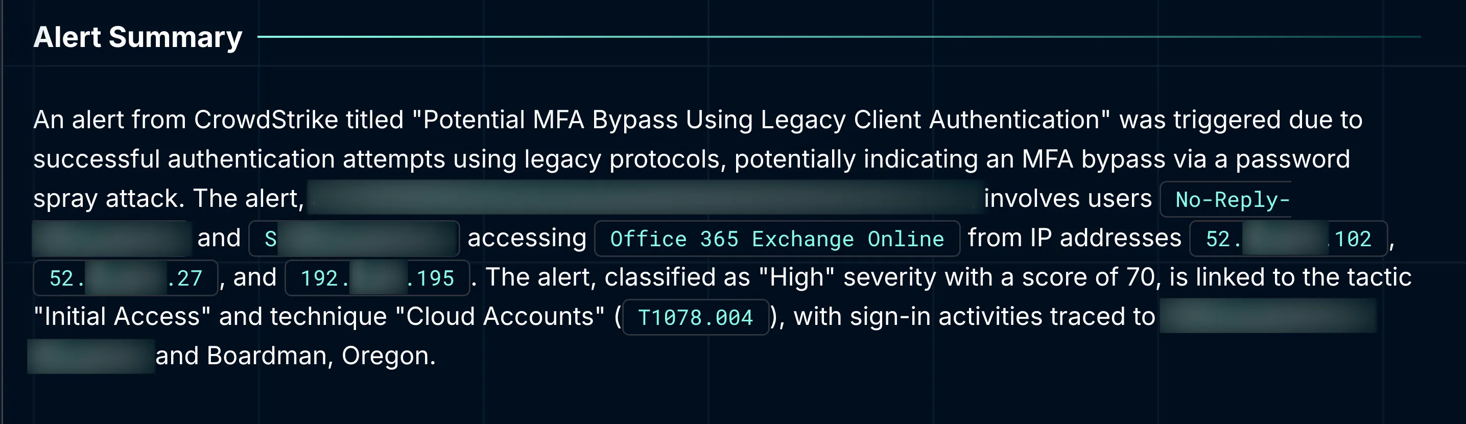 CrowdStrike flagged an incident as "Potential MFA Bypass Using Legacy Client Authentication." The alert centered on two accounts: User A (s**)** and User B (no-reply-****). The concern? Both users had successfully authenticated using legacy protocols from a variety of IP addresses. The user agent used in each case was "BAV2ROPC"—a well-known legacy authentication flow associated with Basic Authentication and Resource Owner Password Credentials.