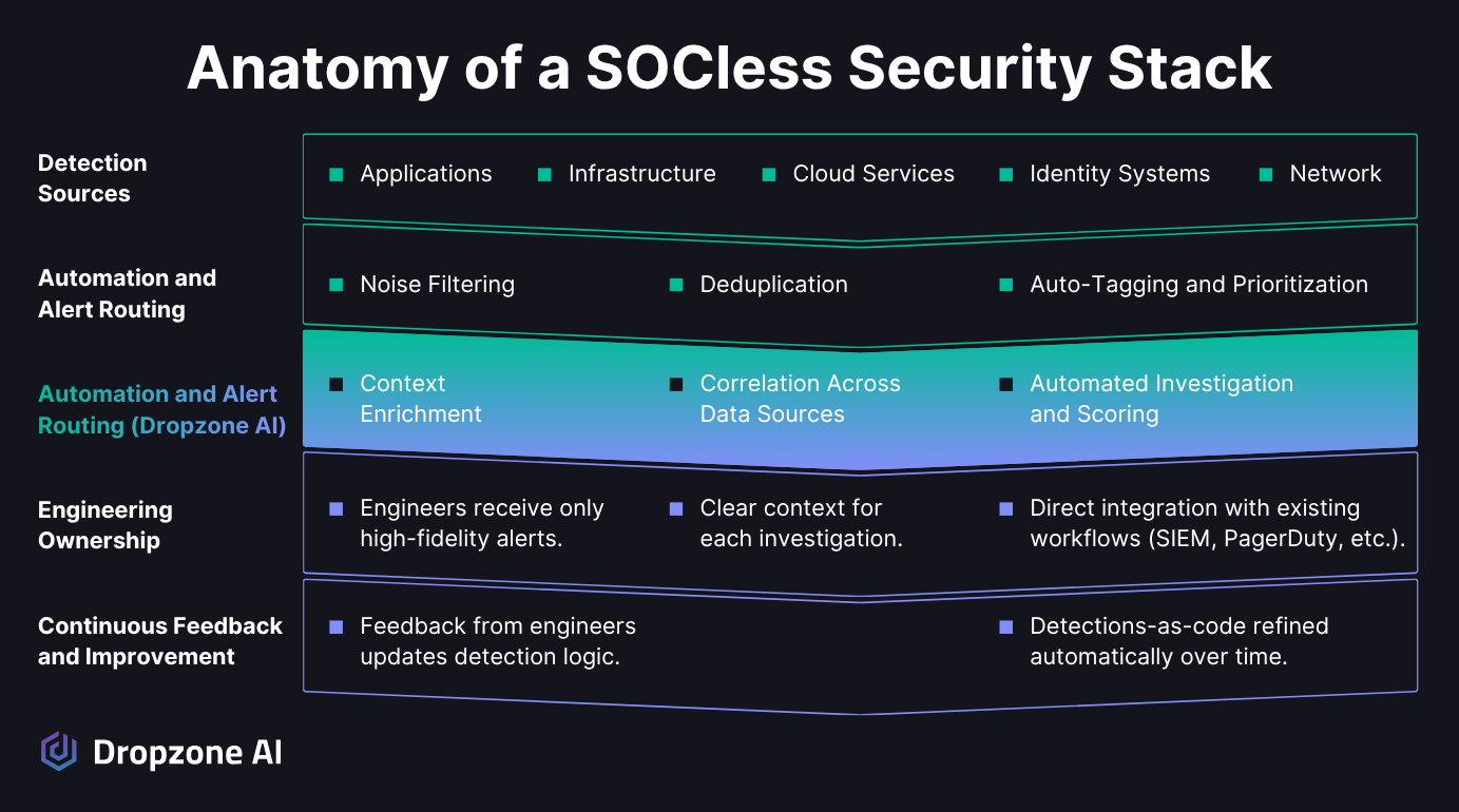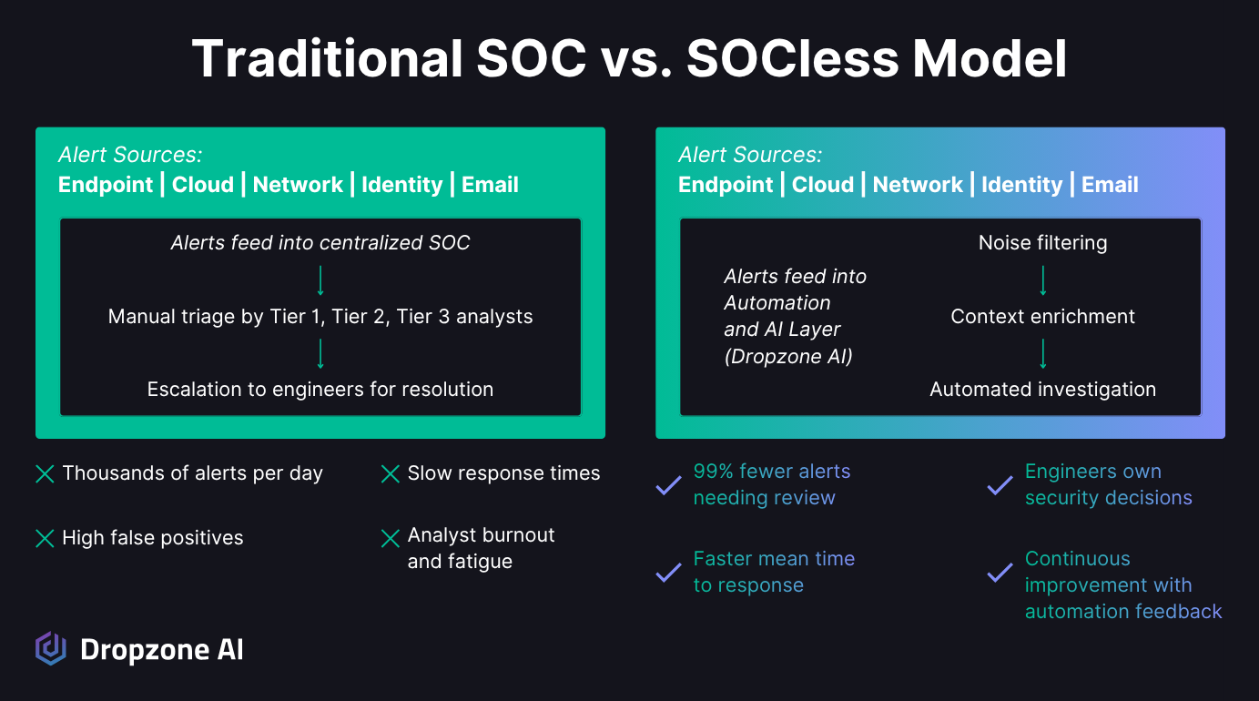 - SOCless shifts security to engineers. Alerts go straight to system owners, supported by automation and detections-as-code.