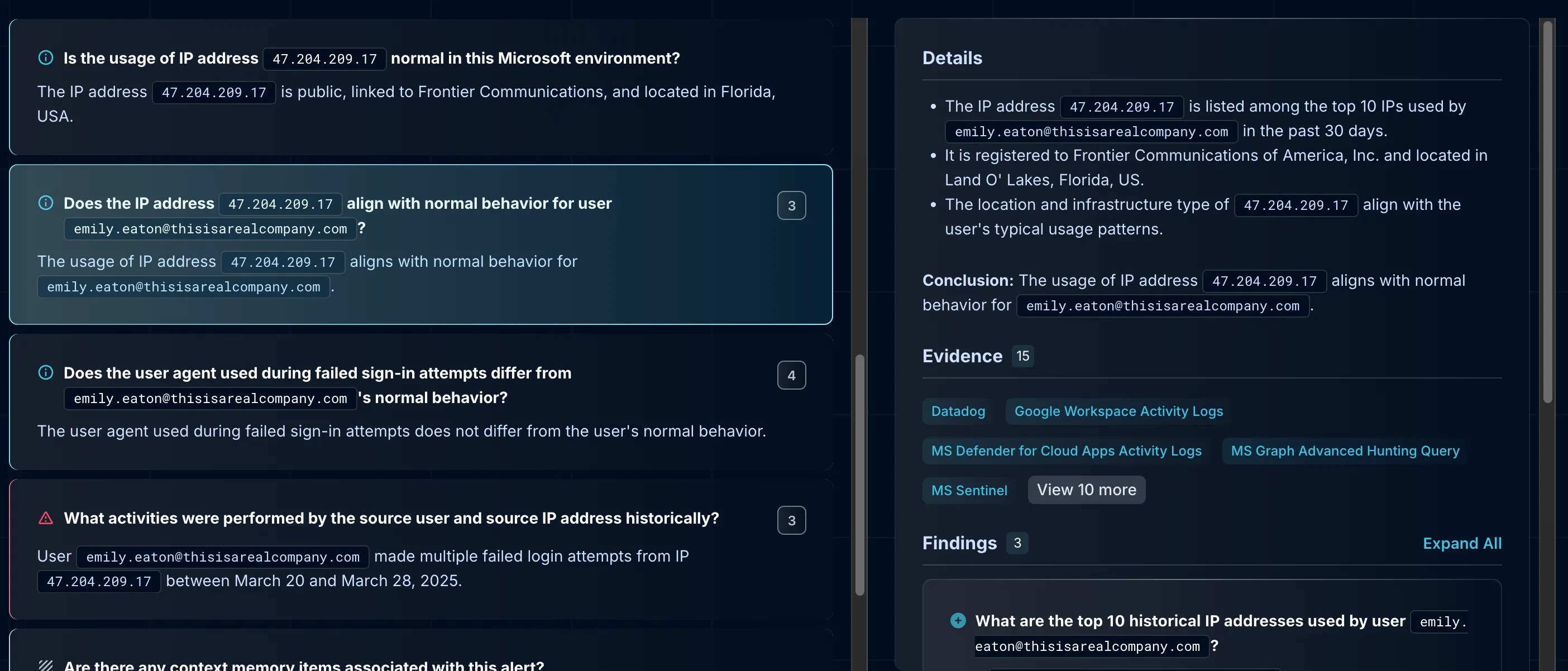 Now that the case is framed, the AI SOC analyst collects data to form findings. For this particular investigation, the agent queries multiple systems: