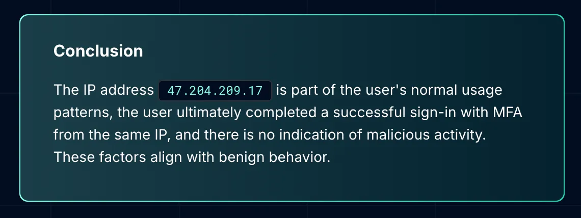 Each data source adds important context. If the same IP and user combination have been used successfully across services historically, it's likely legitimate. Successful MFA authentication with this device, user agent, and IP combination further indicates a false positive.