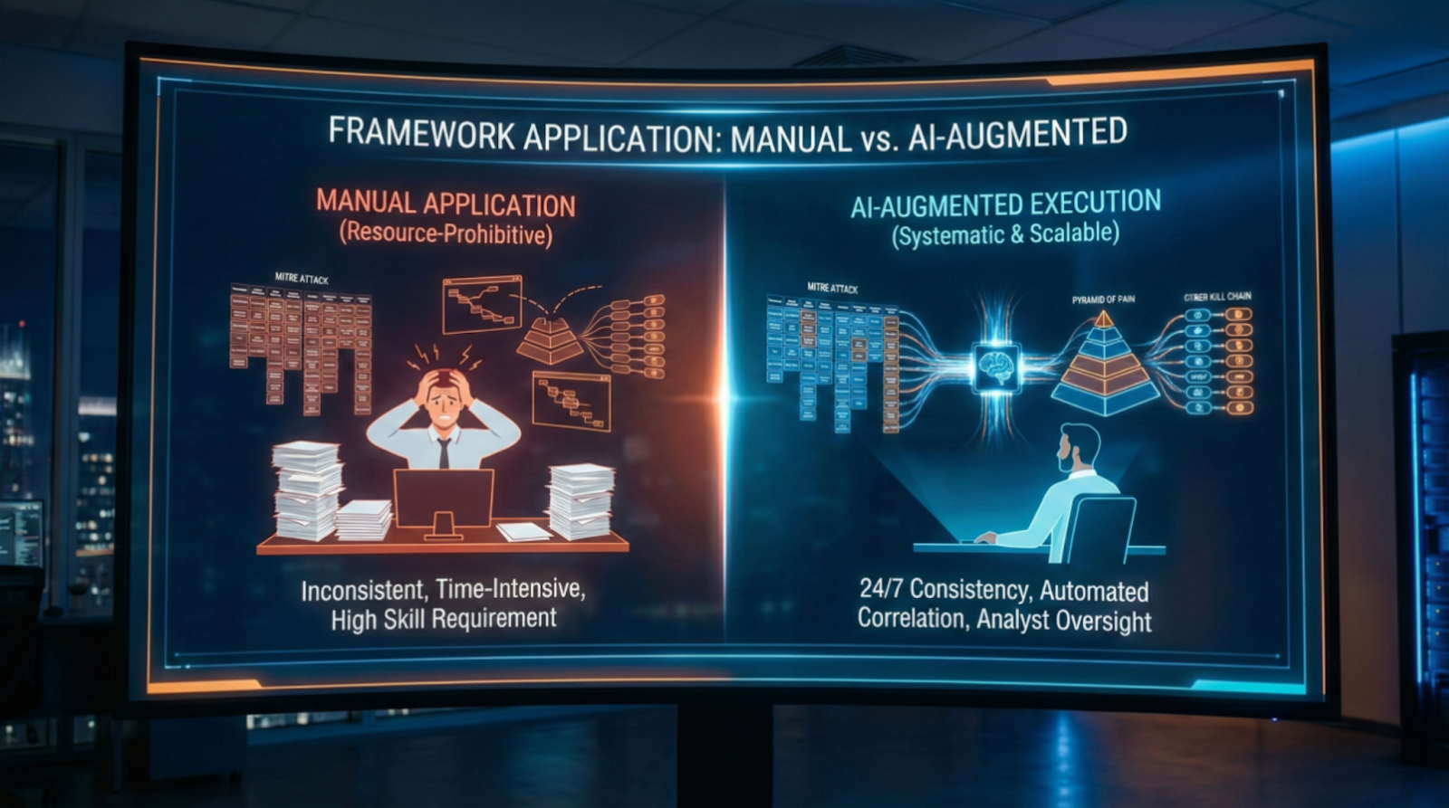 The reality gap: 48% of SOCs still describe hunting as "partially automated" using vendor tools (SANS 2025). Most teams understand frameworks intellectually but struggle with consistent manual application under operational pressure.