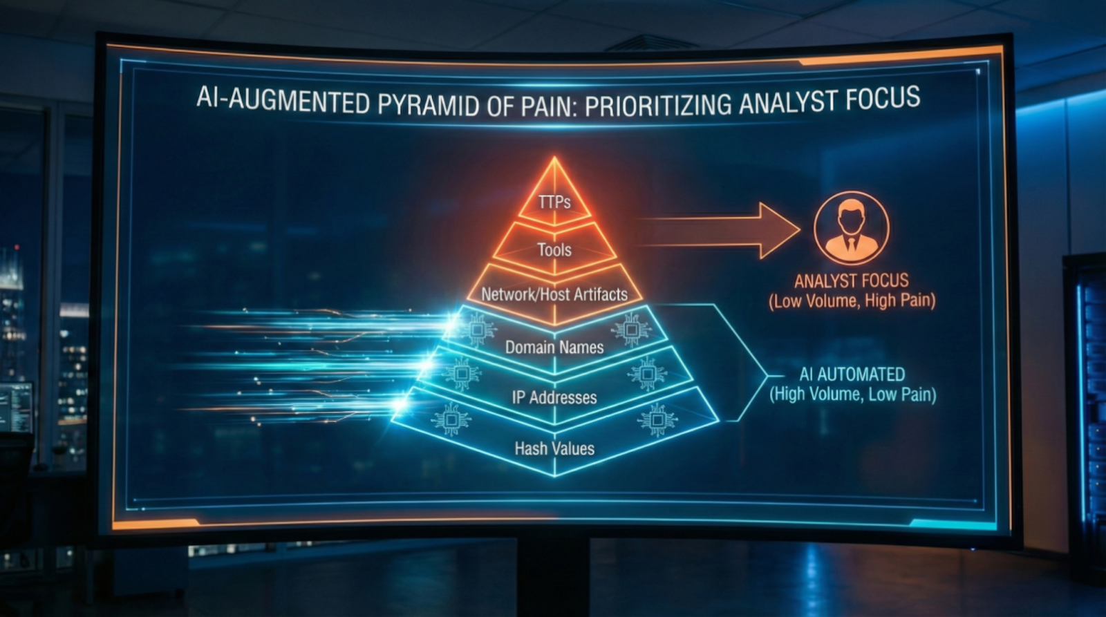 Example: 500 alerts across all pyramid levels. AI processes low-pyramid matches (known-bad IPs, hashes) instantly. Medium-pyramid alerts (artifacts, tools) batched for efficient review. High-pyramid TTP indicators escalated immediately. Result: analyst time focused on severe adversary pain points, not trivial indicators.