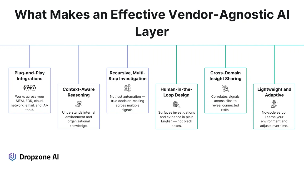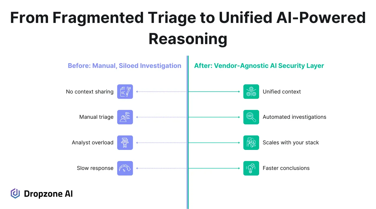 That’s where a vendor-agnostic AI layer impacts you, as it can pull from your SIEM, EDR, identity systems, cloud tools, and threat intel sources and use that combined context to investigate an alert the way that a human would (which is to say, the right way).