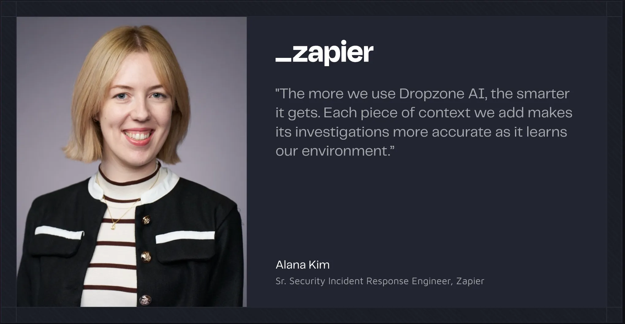 Importantly, Dropzone AI also stores details it learns during investigations in context memory, which allows it to store environmental details and get better with time. This capability is making Dropzone AI an indispensable addition to the SOCs at organizations like Pipe, UiPath, and Zapier. “The more we use Dropzone AI, the smarter it gets. Each piece of context we add makes its investigations more accurate as it learns our environment,” says Alana Kim, Sr. Security Incident Response Engineer at Zapier.