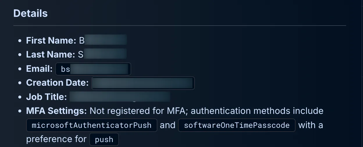 Examining Azure Entra user details showed that the user was created as a user several years prior, with access to numerous internal teams (not displayed). However, an important red flag was present: the user was not currently registered for Multi-Factor Authentication (MFA), a practice strongly recommended to secure such high-level accounts.