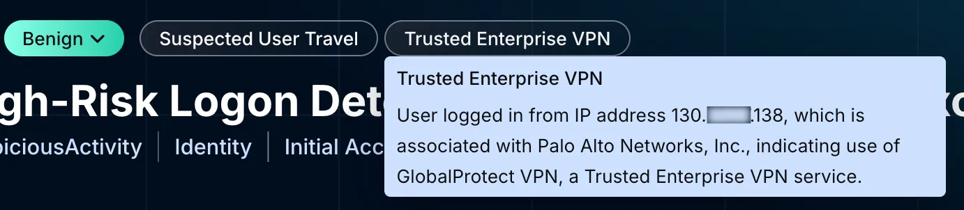 At this point, the analysis pivoted to categorizing insights. Two Dropzone AI insight tags directly aligned with the current findings—“Trusted Enterprise VPN” for Palo Alto’s GlobalProtect and “Suspected User Travel” due to Panasonic Avionics inflight Wi-Fi usage. These quickly explained to the human analyst reviewing the investigation why the activity occurred—the user was traveling internationally and securely logged in via legitimate, known IP addresses and VPN access, negating the initial concerns about malicious behavior.