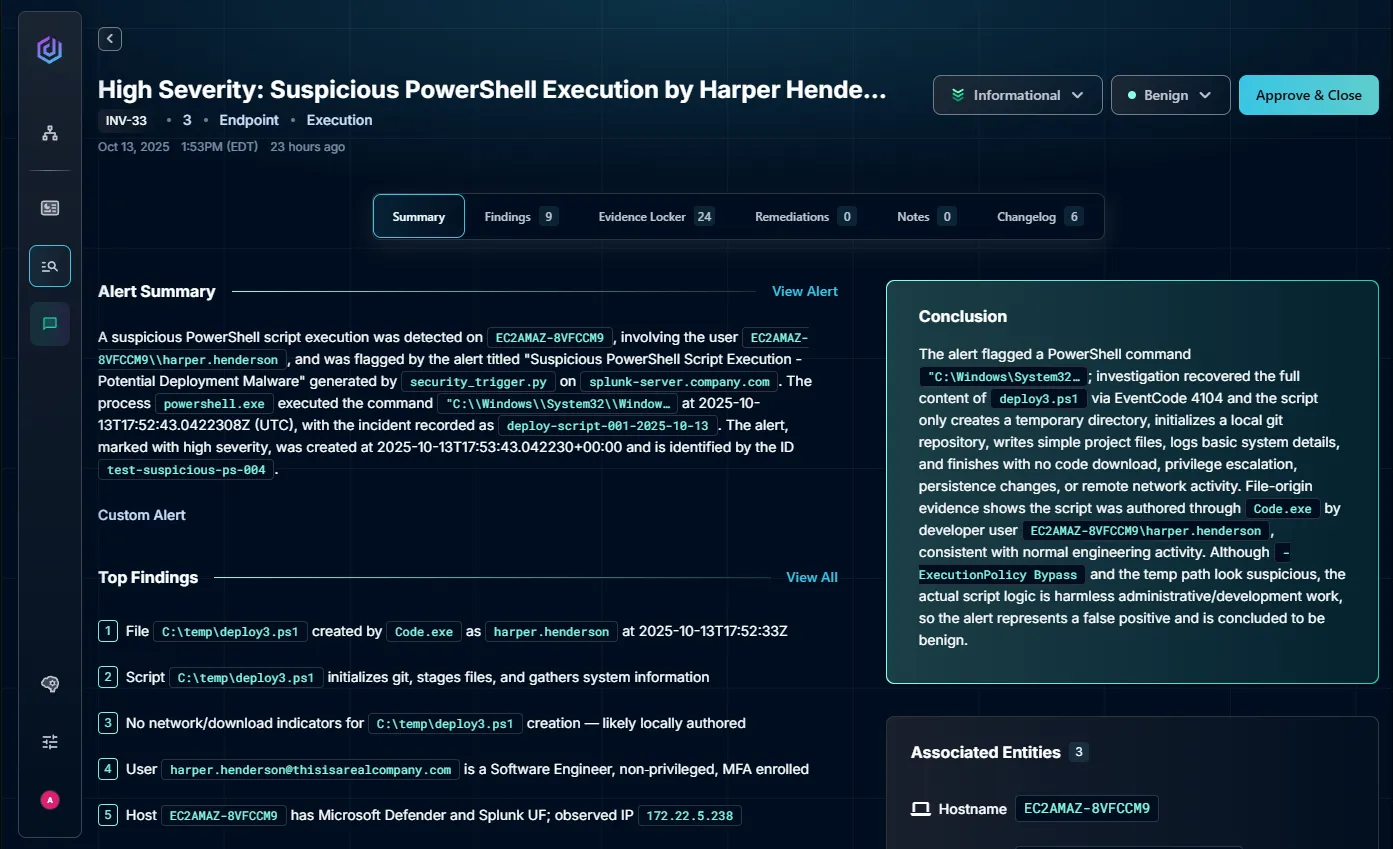 Every Splunk alert receives rigorous investigation automatically through purpose-built integration.