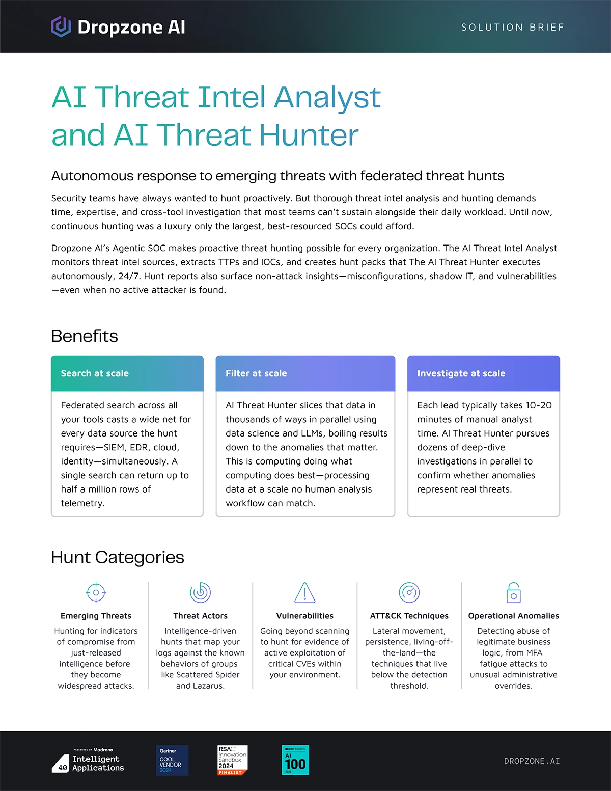 Dropzone AI's autonomous threat hunting agents work 24/7 to monitor thousands of intel sources, extract IOCs and TTPs, and execute federated hunts across your entire security stack — so your team can stay ahead of attackers without the manual workload.